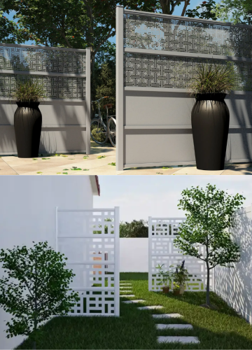 Les panneaux peuvent aussi intégrer des motifs décoratifs découpés au laser. Cette technique consiste à découper directement des formes ou des dessins dans la tôle d’aluminium afin de créer des panneaux décoratifs ajourés. Les motifs peuvent être graphiques, géométriques ou végétaux et permettent d’apporter une véritable dimension esthétique au claustra tout en conservant sa fonction de séparation et de brise-vue.